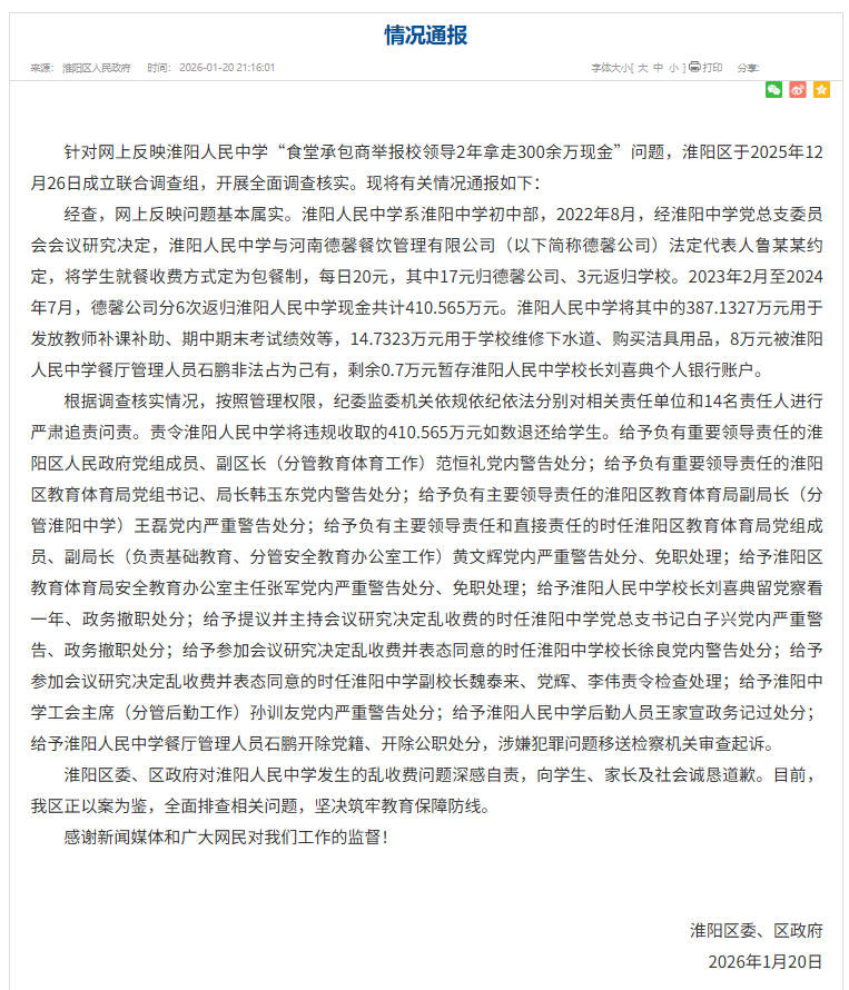 中新網(wǎng)1月21日電 據(jù)周口市淮陽區(qū)人民政府官網(wǎng)消息,近日,淮陽區(qū)委、區(qū)政府發(fā)布通告表示,針對網(wǎng)上反映淮陽人民中學(xué)“食堂承包商舉報(bào)校領(lǐng)導(dǎo)2年拿走300余萬現(xiàn)金”問題,淮陽區(qū)于2025年12月26日成立聯(lián)合調(diào)查組,開展全面調(diào)查核實(shí)。現(xiàn)將有關(guān)情況通報(bào)如下: