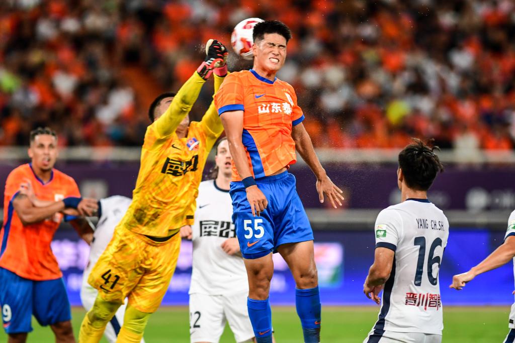 2025年7月27日,山東泰山隊球員彭嘯(右二)在比賽中爭頂。新華社記者 朱崢 攝