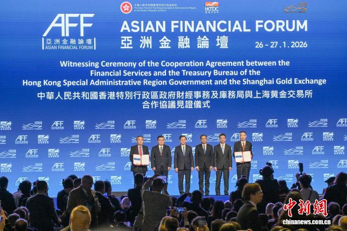 1月26日,在香港揭幕的第19屆亞洲金融論壇上,香港特區(qū)政府財(cái)經(jīng)事務(wù)及庫務(wù)局與上海黃金交易所簽署合作協(xié)議,推動(dòng)兩地黃金市場合作。圖為香港特區(qū)行政長官李家超(左三)、中國人民銀行副行長鄒瀾(右三)等嘉賓見證簽署合作協(xié)議。 中新社記者 陳永諾 攝