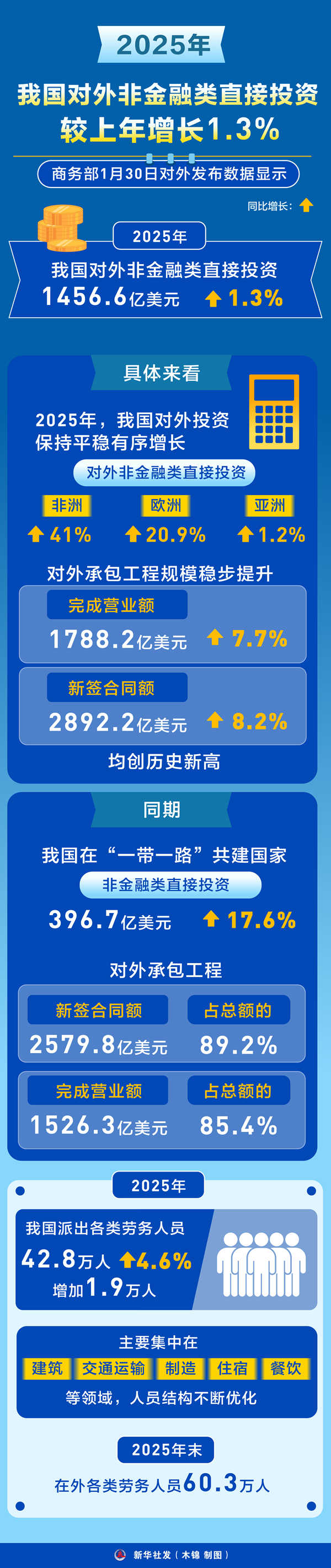 新華社北京1月30日電(記者 謝希瑤)商務部30日對外發(fā)布數(shù)據(jù)顯示,2025年,我國對外非金融類直接投資1456.6億美元,較上年增長1.3%。