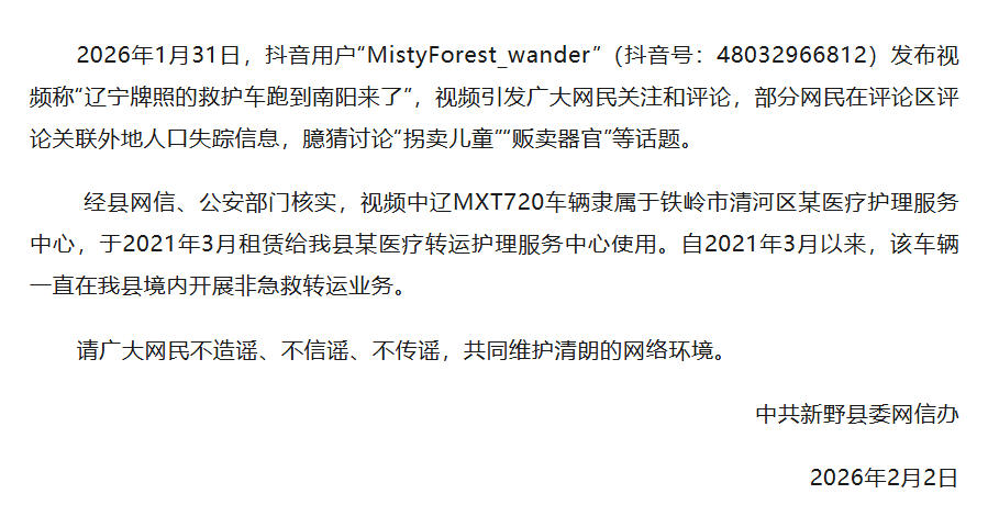 中國(guó)網(wǎng)2月2日訊 據(jù)“新野發(fā)布”微信公眾號(hào)消息,2月2日上午,河南省南陽市新野縣委網(wǎng)信辦發(fā)布情況說明稱,2026年1月31日,抖音用戶“MistyForest_wander”(抖音號(hào):48032966812)發(fā)布視頻稱“遼寧牌照的救護(hù)車跑到南陽來了”,視頻引發(fā)廣大網(wǎng)民關(guān)注和評(píng)論,部分網(wǎng)民在評(píng)論區(qū)評(píng)論關(guān)聯(lián)外地人口失蹤信息,臆猜討論“拐賣兒童”“販賣器官”等話題。