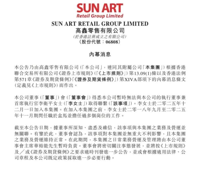 2月4日,大潤發(fā)母公司高鑫零售在港交所發(fā)布公告稱,公司暫時(shí)無法與執(zhí)行董事兼首席執(zhí)行官李衛(wèi)平取得聯(lián)系。