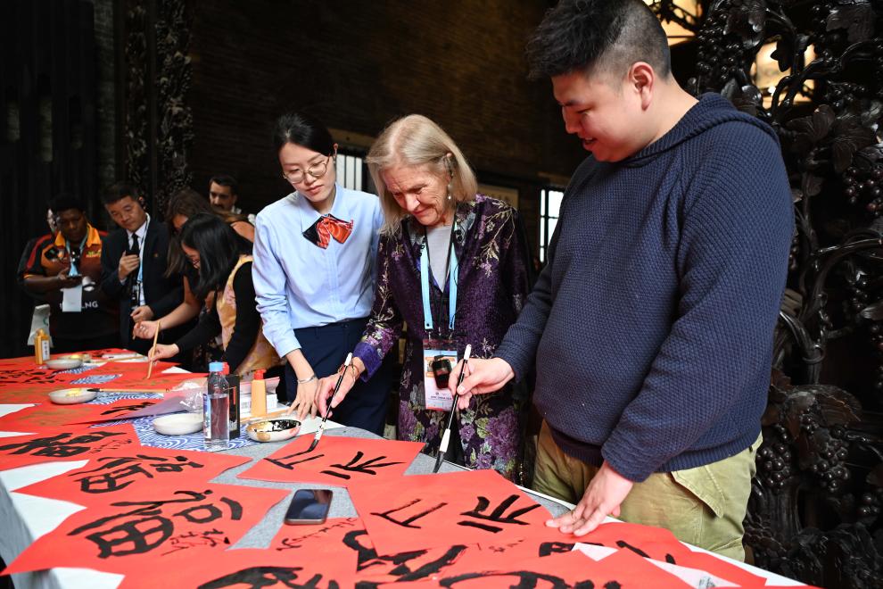 2月6日,亞太經(jīng)濟(jì)合作組織(APEC)2026年第一次高官會(huì)及相關(guān)會(huì)議的部分與會(huì)代表在廣州陳家祠體驗(yàn)中國書法。 新華社記者 鄧華 攝