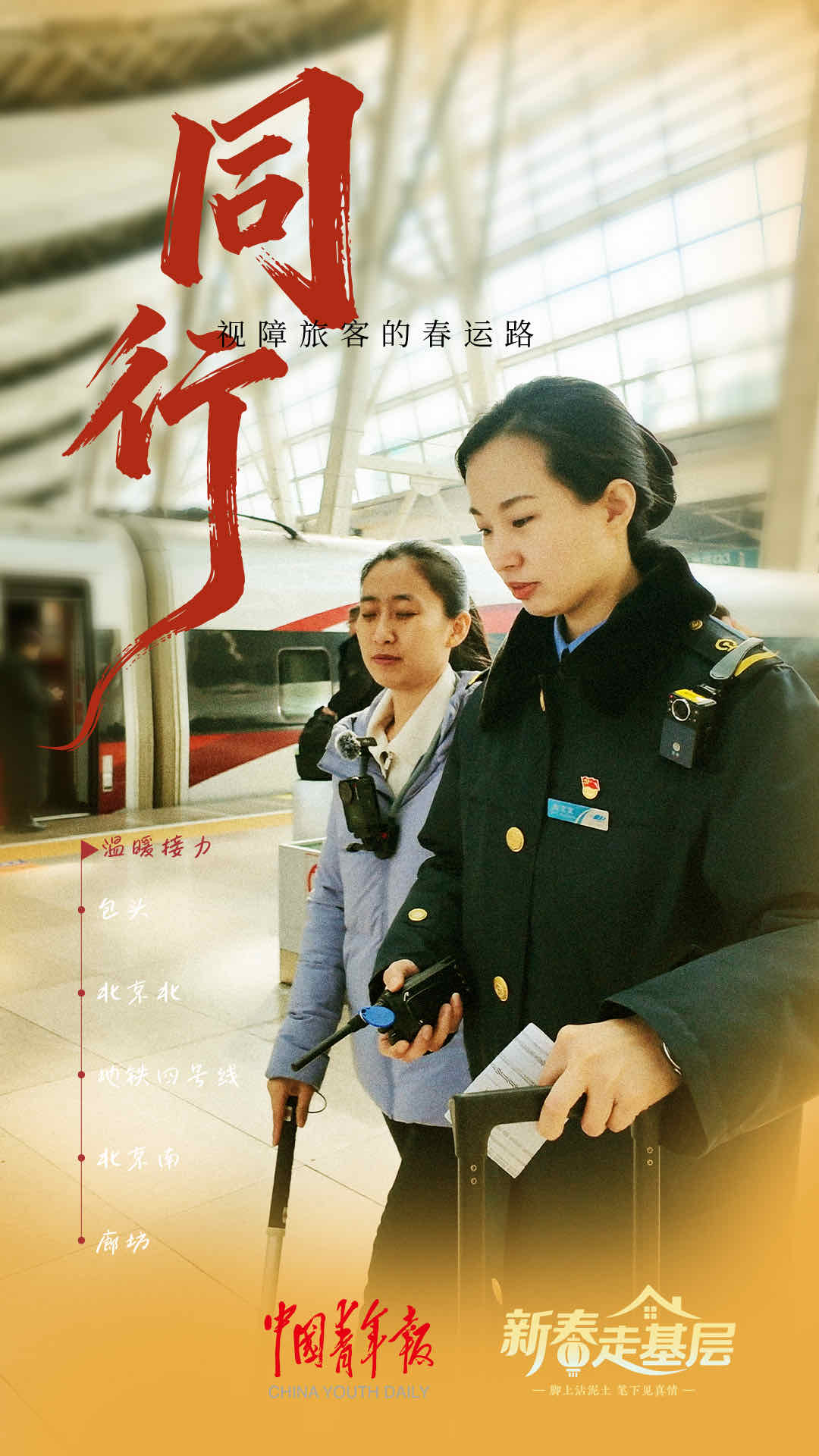 這一路,全程參與接力的鐵路、地鐵工作人員,有十余人。北京北站的工作人員說,春運(yùn)期間,日均服務(wù)重點(diǎn)旅客50至100人。