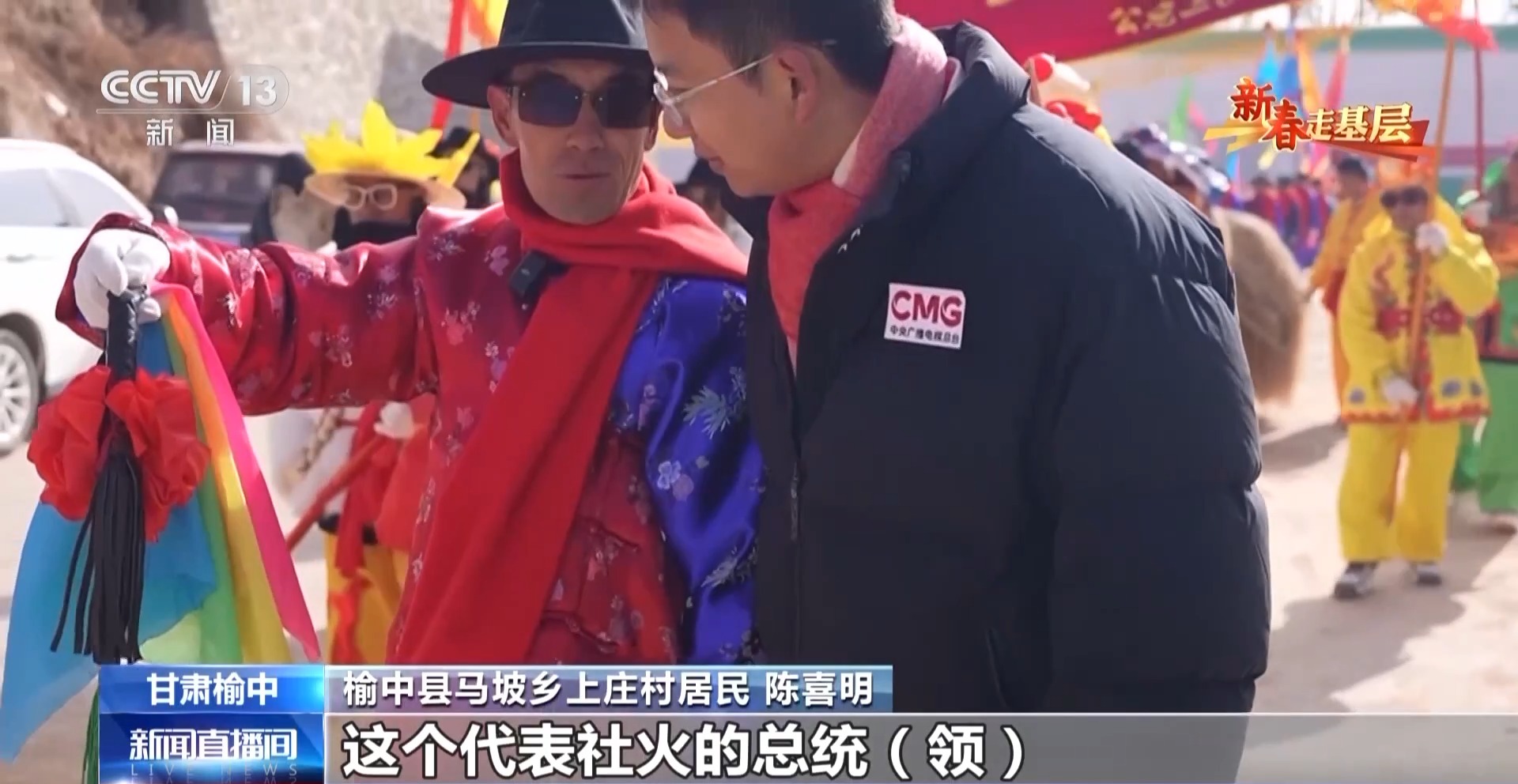 榆中縣馬坡鄉(xiāng)上莊村居民 陳喜明:這個(gè)代表社火的總統(tǒng)領(lǐng),是給我們引場子的,社火就是把大家召集到一起,前段時(shí)間這里遭災(zāi),搞個(gè)社火把大家的精神提一提。