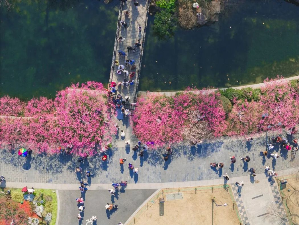 在江南水鄉(xiāng),早春的序曲總是由梅花奏響。江蘇常州便是這抹春色里最具代表性的剪影。龍城正月,古運河畔紅燈籠高掛,紅梅公園內,唐代紅梅閣翹角飛檐,閣前紅梅燦若云霞,恰如趙翼詩中所繪的盛景。這里的賞梅,早已不是單純的游園,而是一場雅俗共賞的年俗盛會。文旅IP“常寶"穿梭送福,打卡點紅燈籠高懸,大年初一的市集上,手作、梅花好物琳瑯滿目,糖畫、梅花酥香氣四溢,文筆塔的花瀑氛圍拉滿,市民在梅香與煙火氣中收獲新春幸福。