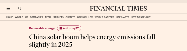 英國《金融時報》日前發(fā)文稱,2025年,太陽能的蓬勃發(fā)展促使中國的碳排放量有所下降。