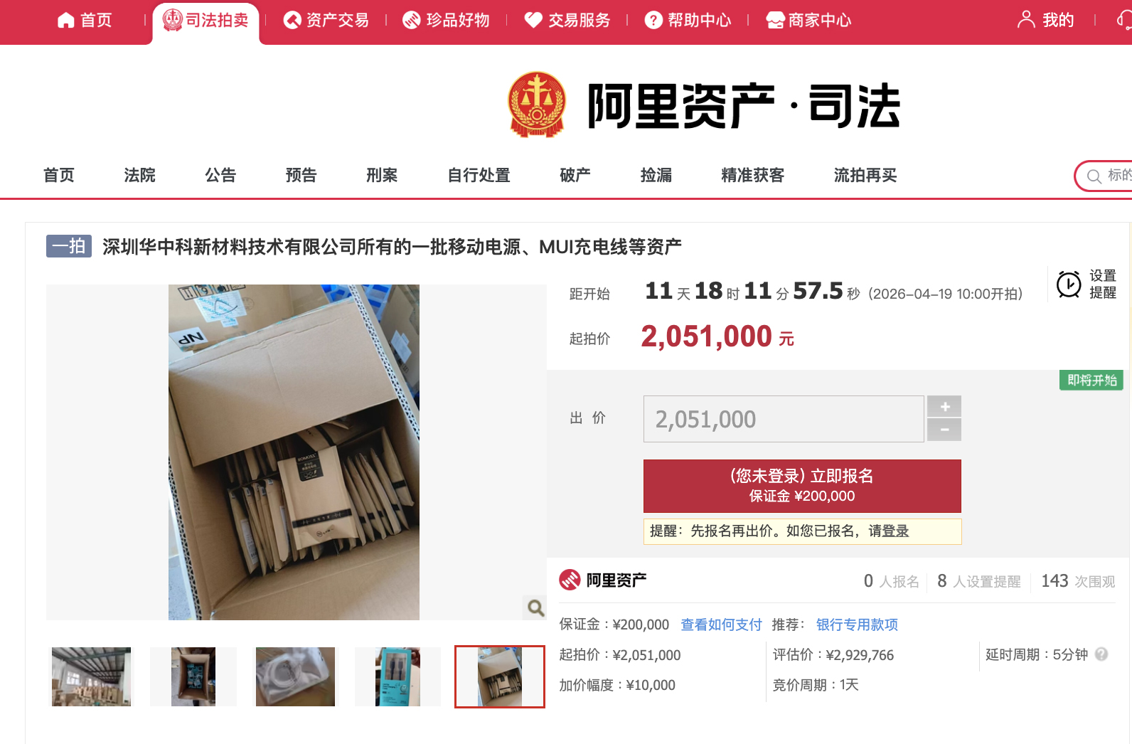 中新網(wǎng)4月7日電(吳家駒)阿里資產(chǎn)·司法平臺(tái)顯示,近日,深圳華中科新材料技術(shù)有限公司所有的一批資產(chǎn)將被司法拍賣(mài),包括:20560只移動(dòng)電源、147478根MUI充電線等,起拍價(jià)205.1萬(wàn)元,評(píng)估價(jià)約292.98萬(wàn)元,拍賣(mài)時(shí)間為4月19日10時(shí)至4月20日10時(shí)。