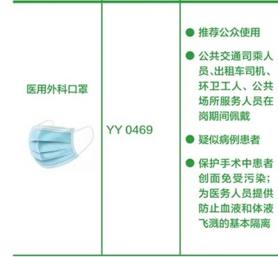 醫(yī)用外科口罩:防護(hù)效果優(yōu)于一次性使用醫(yī)用口罩,推薦公眾包括疑似病例患者、公共交通司乘人員、出租車司機(jī)、環(huán)衛(wèi)工人、公共場所服務(wù)人員在崗期間佩戴。該類型口罩還可保護(hù)手術(shù)中患者創(chuàng)面免受污染,可為醫(yī)務(wù)人員提供防止血液和體液飛濺的基本隔離。(橫列為口罩的圖片+名稱、產(chǎn)品標(biāo)準(zhǔn)、建議應(yīng)用場景。圖片來源:中國疾控中心)