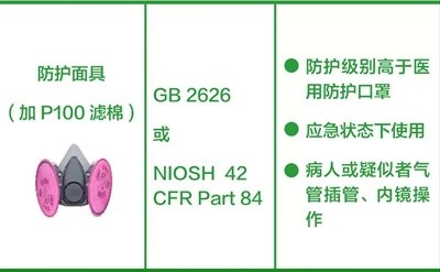 防護(hù)面具(加P100濾棉):防護(hù)級別高于醫(yī)用防護(hù)口罩,建議用于確診或疑似病例的氣管插管、內(nèi)鏡等操作。(橫列為口罩的圖片+名稱、產(chǎn)品標(biāo)準(zhǔn)、建議應(yīng)用場景。圖片來源:中國疾控中心)