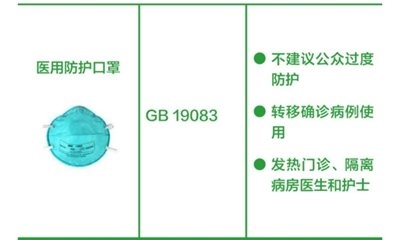 醫(yī)用防護(hù)口罩:推薦發(fā)熱門診、隔離病房醫(yī)護(hù)人員,以及確診新型冠狀病毒感染患者轉(zhuǎn)移使用。資源缺乏時(shí),不建議公眾過度防護(hù),可留給一線醫(yī)護(hù)人員使用。(橫列為口罩的圖片+名稱、產(chǎn)品標(biāo)準(zhǔn)、建議應(yīng)用場景。圖片來源:中國疾控中心)