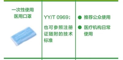 一次性使用醫(yī)用口罩:推薦公眾和醫(yī)療機(jī)構(gòu)的日常使用。(橫列為口罩的圖片+名稱、產(chǎn)品標(biāo)準(zhǔn)、建議應(yīng)用場景。圖片來源:中國疾控中心)