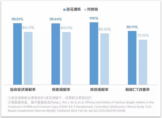 具體來看,與常規(guī)治療組相比,使用了連花清咳片的患者在咳嗽、咳痰緩解率以及胸部CT改善率方面均有更好的表現(xiàn),同時(shí),緩解時(shí)間也有所提前,且無不良反應(yīng)事件。