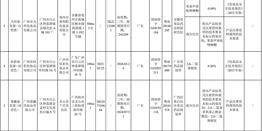 人民網(wǎng)北京9月5日電 (記者孫紅麗)國家藥監(jiān)局近日發(fā)布通告,在2023年國家化妝品抽樣檢驗(yàn)工作中,經(jīng)重慶市食品藥品檢驗(yàn)檢測(cè)研究院等單位檢驗(yàn),產(chǎn)品標(biāo)簽標(biāo)示為廣州市天科化妝品有限公司生產(chǎn)的天科染發(fā)膏(自然黑)等23批次化妝品不符合規(guī)定。