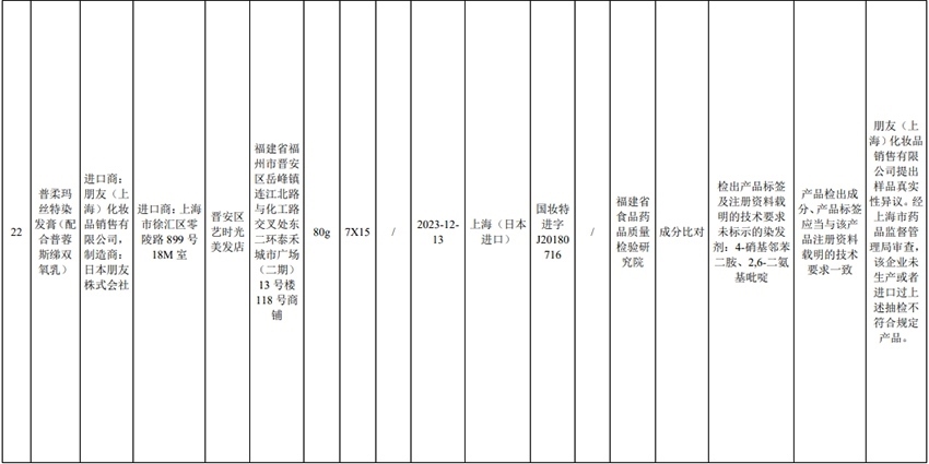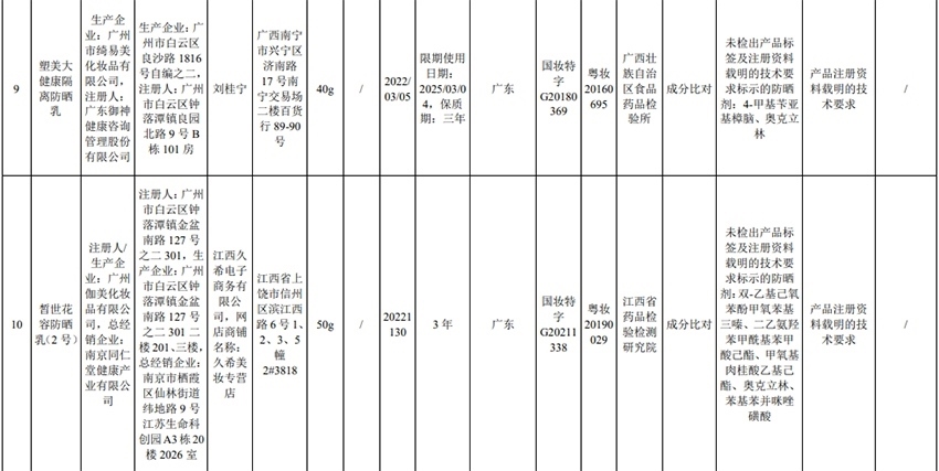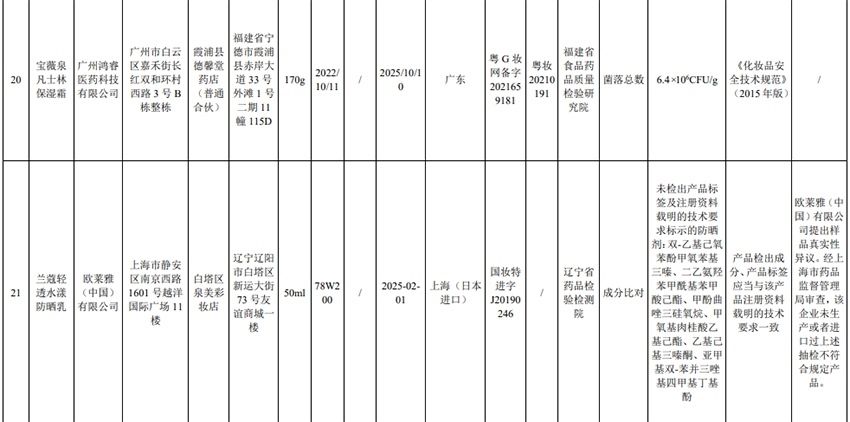 記者注意到,其中,產(chǎn)品標(biāo)簽標(biāo)示為歐萊雅(中國)有限公司生產(chǎn)的蘭蔻輕透水漾防曬乳(標(biāo)示批號(hào):78W200)“未檢出產(chǎn)品標(biāo)簽及注冊(cè)資料載明的技術(shù)要求標(biāo)示的防曬劑”;產(chǎn)品標(biāo)簽標(biāo)示為朋友(上海)化妝品銷售有限公司進(jìn)口的普柔瑪絲特染發(fā)膏(配合普蓉斯綈雙氧乳)(標(biāo)示批號(hào):7X15)“檢出產(chǎn)品標(biāo)簽及注冊(cè)資料載明的技術(shù)要求未標(biāo)示的染發(fā)劑”;產(chǎn)品標(biāo)簽標(biāo)示為資生堂(中國)投資有限公司經(jīng)銷的安熱沙金燦倍護(hù)防曬啫喱(標(biāo)示批號(hào):1356TD)“產(chǎn)品標(biāo)簽與注冊(cè)資料載明的技術(shù)要求不一致”、“未檢出產(chǎn)品標(biāo)簽標(biāo)示的防曬劑”、“未檢出注冊(cè)資料載明的技術(shù)要求標(biāo)示的防曬劑”。