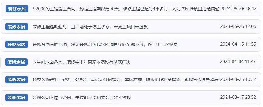 其實(shí),有著同樣遭遇的消費(fèi)者不在少數(shù)。公開(kāi)報(bào)道顯示,今年以來(lái)有多個(gè)家裝機(jī)構(gòu)分公司或經(jīng)銷(xiāo)商跑路,還有個(gè)別不良裝修公司在短時(shí)間內(nèi)聚收大量預(yù)付款后攜款跑路,給消費(fèi)者帶來(lái)經(jīng)濟(jì)財(cái)產(chǎn)損失?!叭嗣裢对V”梳理發(fā)現(xiàn),除閉店跑路外,目前平臺(tái)上涉及家裝消費(fèi)類(lèi)的投訴問(wèn)題多聚焦于——