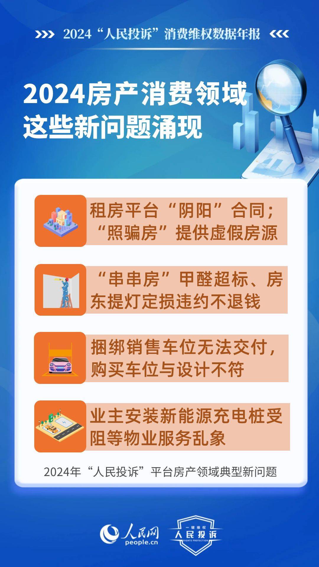 新問題體現(xiàn)在:租房平臺“陰陽”合同、提供虛假房源、甲醛超標不退款、違約不退定金/押金等;捆綁銷售車位無法交付,購買車位與設計不符,人防車位/不合格機械車位當普通車位賣,無法正常使用,業(yè)主安裝充電樁受阻等。