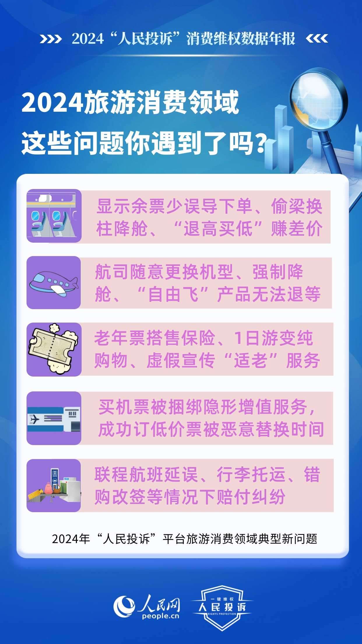 2024年,旅游消費持續(xù)火爆,以舊換新“換”出消費新活力,直播電商“品質(zhì)化”轉(zhuǎn)型,新能源汽車購銷兩旺……在消費市場熱力持續(xù)提升的背景下,旅游產(chǎn)品退訂難,電商促銷虛假價保,直播間營銷違規(guī),車險車貸服務欺詐,AI培訓貨不對板等消費侵權(quán)問題引發(fā)廣泛關注。“人民投訴”發(fā)布年報帶您回顧這一年來,平臺消費維權(quán)熱點和入駐企業(yè)積極處理糾紛的舉措。