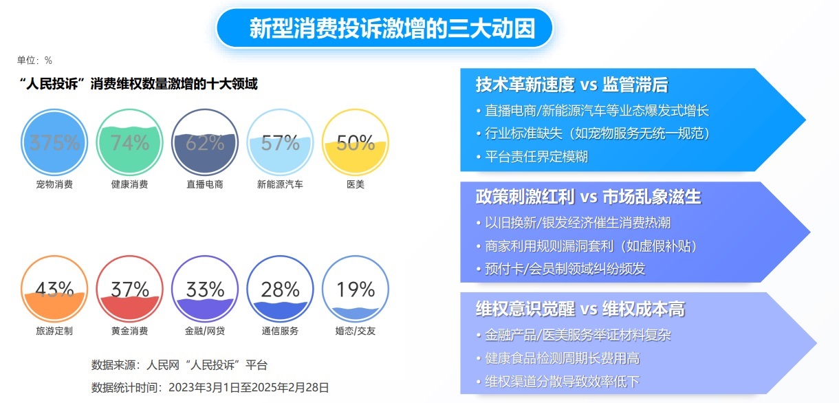 “人民投訴”綜合分析,技術(shù)驅(qū)動新業(yè)態(tài)與監(jiān)管未能同步、政策刺激紅利與市場亂象并存、維權(quán)意識提升與維權(quán)成本矛盾這三大因素共同成為推高新型消費(fèi)領(lǐng)域風(fēng)險(xiǎn)的原因。