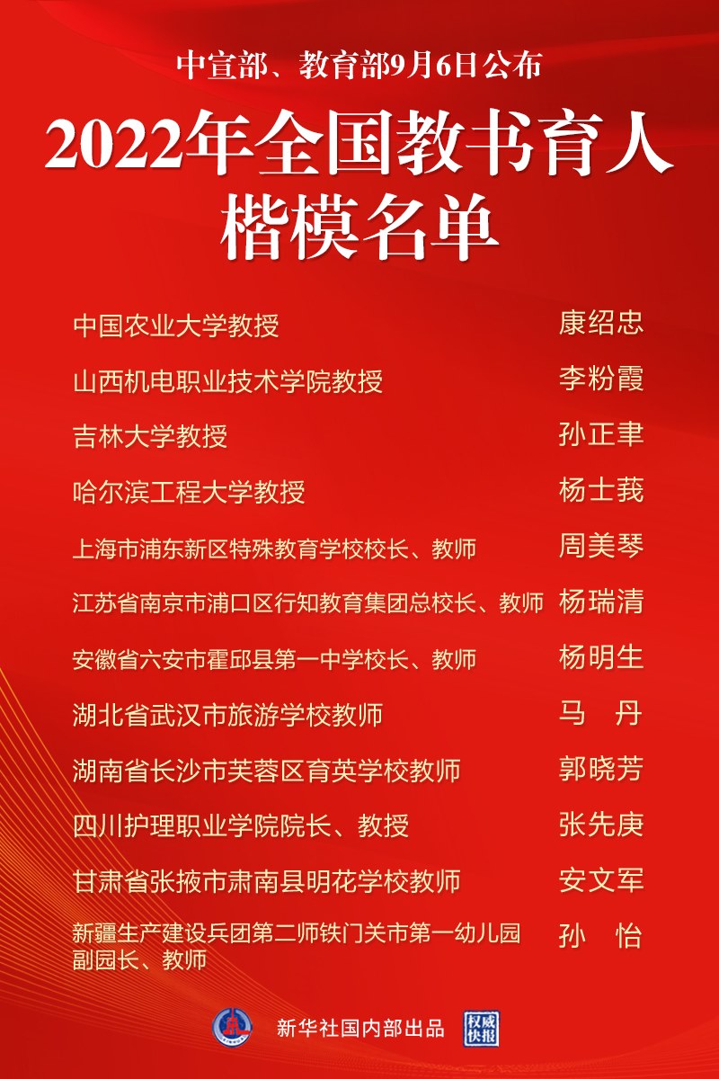 這12位全國教書育人楷模,有的深耕思政課堂、傳播黨的創(chuàng)新理論,有的勇攀科研高峰、取得顯著成果,有的一輩子扎根基層、矢志奉獻山區(qū)教育,有的創(chuàng)新思路方法、為孩子傾注大愛深情,充分展示了新時代教師隊伍有理想信念、有道德情操、有扎實學(xué)識、有仁愛之心的良好精神風(fēng)貌,是廣大人民教師的優(yōu)秀代表和杰出典范。他們是:中國農(nóng)業(yè)大學(xué)教授康紹忠,山西機電職業(yè)技術(shù)學(xué)院教授李粉霞,吉林大學(xué)教授孫正聿,哈爾濱工程大學(xué)教授楊士莪,上海市浦東新區(qū)特殊教育學(xué)校校長、教師周美琴,江蘇省南京市浦口區(qū)行知教育集團總校長、教師楊瑞清,安徽省六安市霍邱縣第一中學(xué)校長、教師楊明生,湖北省武漢市旅游學(xué)校教師馬丹,湖南省長沙市芙蓉區(qū)育英學(xué)校教師郭曉芳,四川護理職業(yè)學(xué)院院長、教授張先庚,甘肅省張掖市肅南縣明花學(xué)校教師安文軍,新疆生產(chǎn)建設(shè)兵團第二師鐵門關(guān)市第一幼兒園副園長、教師孫怡。