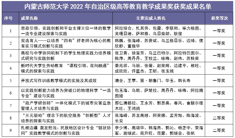 北疆新聞網(wǎng)、北疆新聞APP、北疆云消息(記者 李艷紅)近日,內(nèi)蒙古自治區(qū)教育廳發(fā)布了《關于公布2022年自治區(qū)級高等教育教學成果獎獲獎成果的通知》,內(nèi)蒙古師范大學微官網(wǎng)由數(shù)學科學學院牽頭、黨委書記阿拉坦倉主持的《思政引領、實踐創(chuàng)新和平臺支撐三位一體的數(shù)學一流專業(yè)建設與實踐》等17個推薦至自治區(qū)的教學成果均獲獎,實現(xiàn)了100%的獲獎率。其中,一等獎7項,二等獎4項,三等獎6項。一等獎獲獎數(shù)量及總獲獎率位居全區(qū)之首。