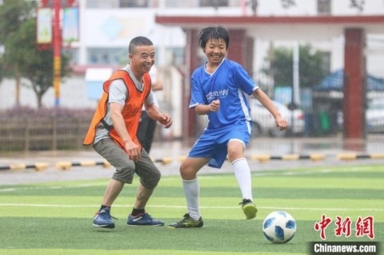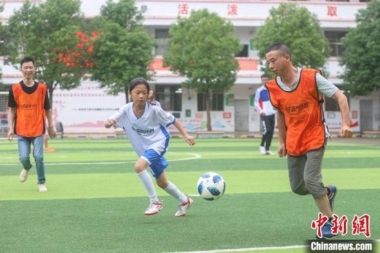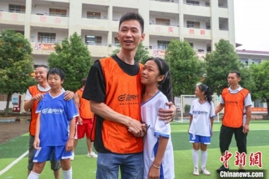 “今天第一次和爸爸踢球,我特別高興和感動。他踢得很好,還帶球過了我?guī)状巍N蚁M职忠院竽芏嗯阄姨咔?。?4日,在江西贛州尋烏縣澄江中心校的足球場上,來自該校晨曦女子足球隊的隊員廖怡菱和其他四位隊員在父親節(jié)前夕,驚喜地見到了自己身在外地工作的父親,并第一次和父親一起踢球,進行了一場特別的親子足球賽。