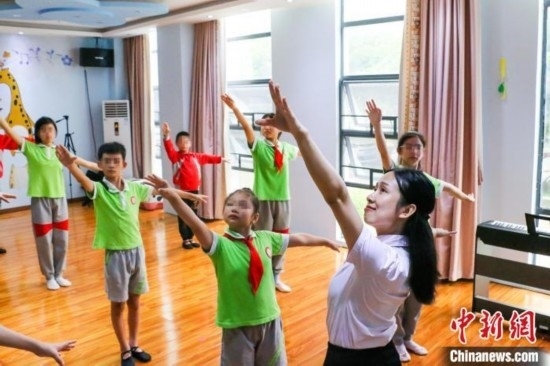 榮獲“廣東好人”稱號的姚蘊儀11日在廣東汕頭市潮南區(qū)特殊教育學校教聽障孩子練習舞蹈。鐘欣 攝
