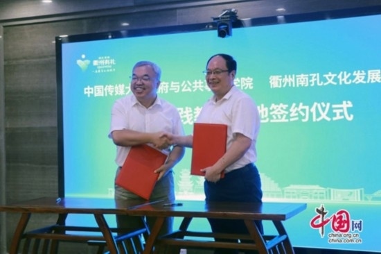 隨后,中國傳媒大學(xué)實習(xí)實踐教學(xué)基地合作協(xié)議簽約儀式在中國儒學(xué)館四樓舉行。中國傳媒大學(xué)政府與公共事務(wù)學(xué)院副院長白文剛;市文化廣電旅游局黨委副書記、副局長程玲出席會議并致辭,市文旅局黨委委員、南孔文化發(fā)展中心主任盛雄生參加。
