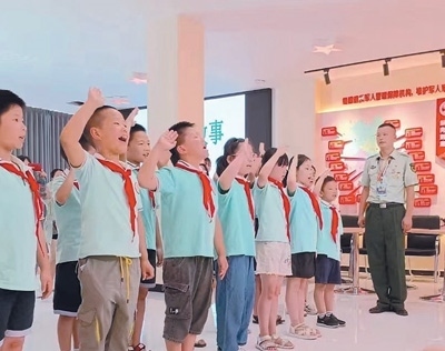 四川鹽亭縣文同小學(xué)學(xué)生在縣退役軍人之家活動中心學(xué)習(xí)英模事跡,獻(xiàn)唱少先隊(duì)隊(duì)歌。李 勤攝(人民視覺)