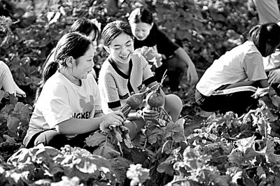 河北省樂亭縣新寨鎮(zhèn)蘭坨小學(xué)學(xué)生在“校園農(nóng)場(chǎng)”收獲蘿卜。新華社發(fā)