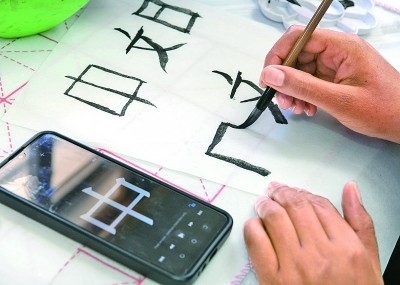 英國倫敦,一名學生在2023年“國際中文日”英國主題活動上展示自己的書法。新華社發(fā)