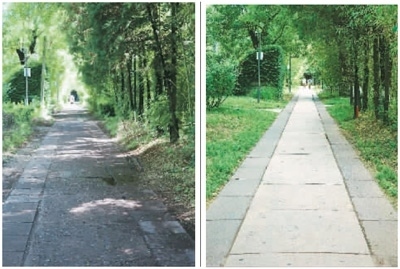 左圖:保護(hù)項(xiàng)目對燕南園水泥路修復(fù)前的景象。右圖:保護(hù)項(xiàng)目對燕南園水泥路進(jìn)行修復(fù)后的效果。燕南園保存下來的水泥路以“脫漿彩石混凝土”工藝進(jìn)行施工,老校友稱之為“洋灰路”。這里的“洋灰路”已有76年歷史,大部分仍能正常使用。北大建筑與景觀設(shè)計學(xué)院的李迪華老師發(fā)現(xiàn),燕南園東側(cè)水泥路破損后,顯露出大小和顏色都參差不齊的石子。于是,他開始追溯這些“洋灰路”的歷史價值,與北大“燕園公益營建社”的黃可同學(xué)翻閱北大檔案館資料,找到了歷史照片。又幾經(jīng)輾轉(zhuǎn),尋訪到了九旬高齡的老校友。研究發(fā)現(xiàn),燕園中最早的水泥路修建于1948年。為此,李迪華大力呼吁保護(hù)這些水泥路,尋訪到專門修復(fù)歷史路面的施工團(tuán)隊(duì),對少量保存完整的路面進(jìn)行修復(fù);破損的洋灰原料則被回收,取出原骨料,采用相同的工藝進(jìn)行還原。不僅老材料得到循環(huán)利用,歷史道路的價值也“凝固”在更新后的路面中。