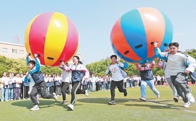 安徽省淮北市第十二中學(xué),高三學(xué)生在參加趣味比賽。萬(wàn)善朝攝(影像中國(guó))