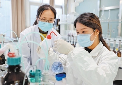 山東省棗莊市西王莊鎮(zhèn)一個(gè)實(shí)驗(yàn)室內(nèi),碩士研究生晁齊齊(右)在做化學(xué)實(shí)驗(yàn)。孫中喆攝(人民視覺(jué))