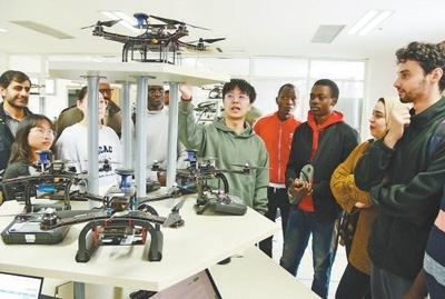 江蘇大學(xué)第四屆計(jì)算機(jī)文化節(jié)上,外國(guó)留學(xué)生在了解無(wú)人機(jī)功能和運(yùn)行原理。石玉成攝(影像中國(guó))