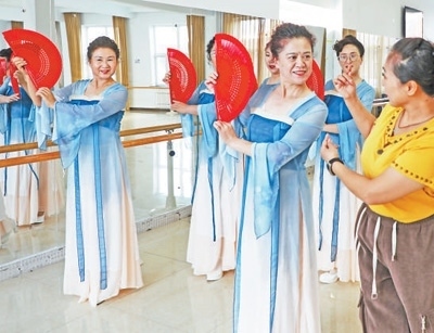內(nèi)蒙古自治區(qū)呼倫貝爾市扎蘭屯市老年活動(dòng)中心,幾名學(xué)員在老年大學(xué)上舞蹈課。韓穎群攝(影像中國(guó))