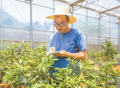 | 曹立新在柑橘種苗大棚里做記錄。鄭家裕攝 |