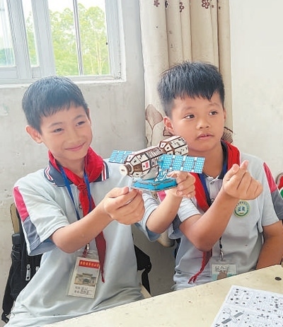 廣西壯族自治區(qū)貴港市平南縣廖村小學(xué)的學(xué)生在展示科普活動作品。廣西科技館供圖