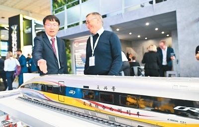 日前,在德國(guó)柏林軌道交通展上,中國(guó)鐵道科學(xué)研究院集團(tuán)有限公司工作人員(左)向參觀者介紹復(fù)興號(hào)高速綜合檢測(cè)列車模型。新華社發(fā)