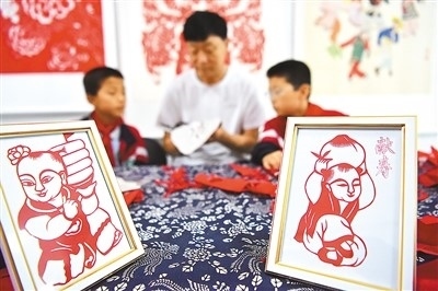 山東高密姜莊鎮(zhèn)產(chǎn)學研實踐基地內(nèi),非遺傳承人指導小朋友剪紙。李海濤攝(人民圖片)