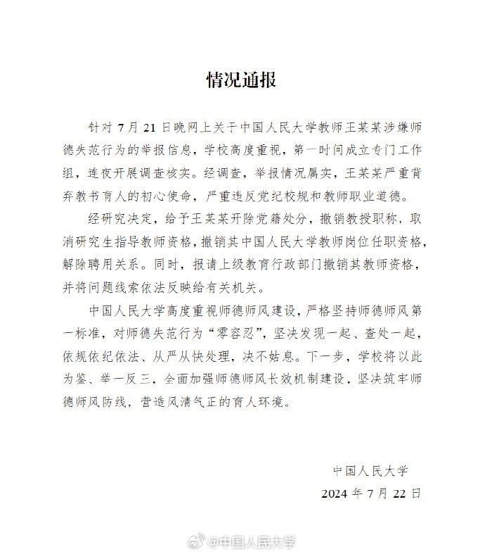 通報中稱,學校高度重視,第一時間成立專門工作組,連夜開展調查核實。經(jīng)研究決定,給予王某某開除黨籍處分,撤銷教授職稱,取消研究生指導教師資格,撤銷其中國人民大學教師崗位任職資格,解除聘用關系。同時,報請上級教育行政部門撤銷其教師資格,并將問題線索依法反映給有關機關。