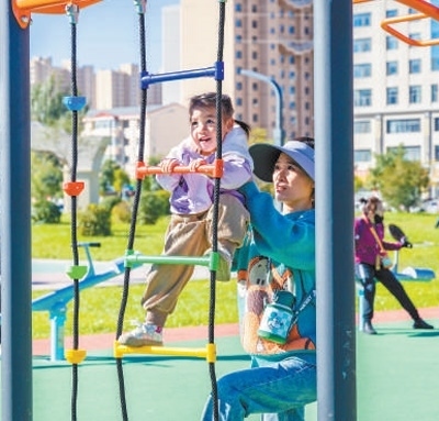 內(nèi)蒙古呼和浩特萬(wàn)和體育公園,家長(zhǎng)幫助孩子攀爬軟梯。丁根厚攝(影像中國(guó))