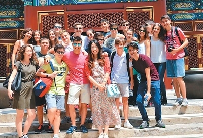 | 孫曉宇(前排左四)帶著意大利羅馬國立住讀學(xué)校學(xué)生在北京參加夏令營。 |