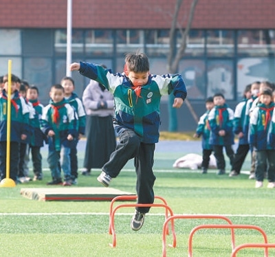 青島市李滄區(qū)是山東省內較早推廣15分鐘課間的地區(qū),當?shù)馗餍R虻刂埔?,結合校園特色將體育活動開展得豐富多彩。青島東川路小學在操場分設6個活動點,地面上畫好跳房子、百變大腳丫、步步登高、投擲區(qū)等不同格子,由班主任帶領學生,開發(fā)多種闖關類游戲,鼓勵學生創(chuàng)造新玩法。