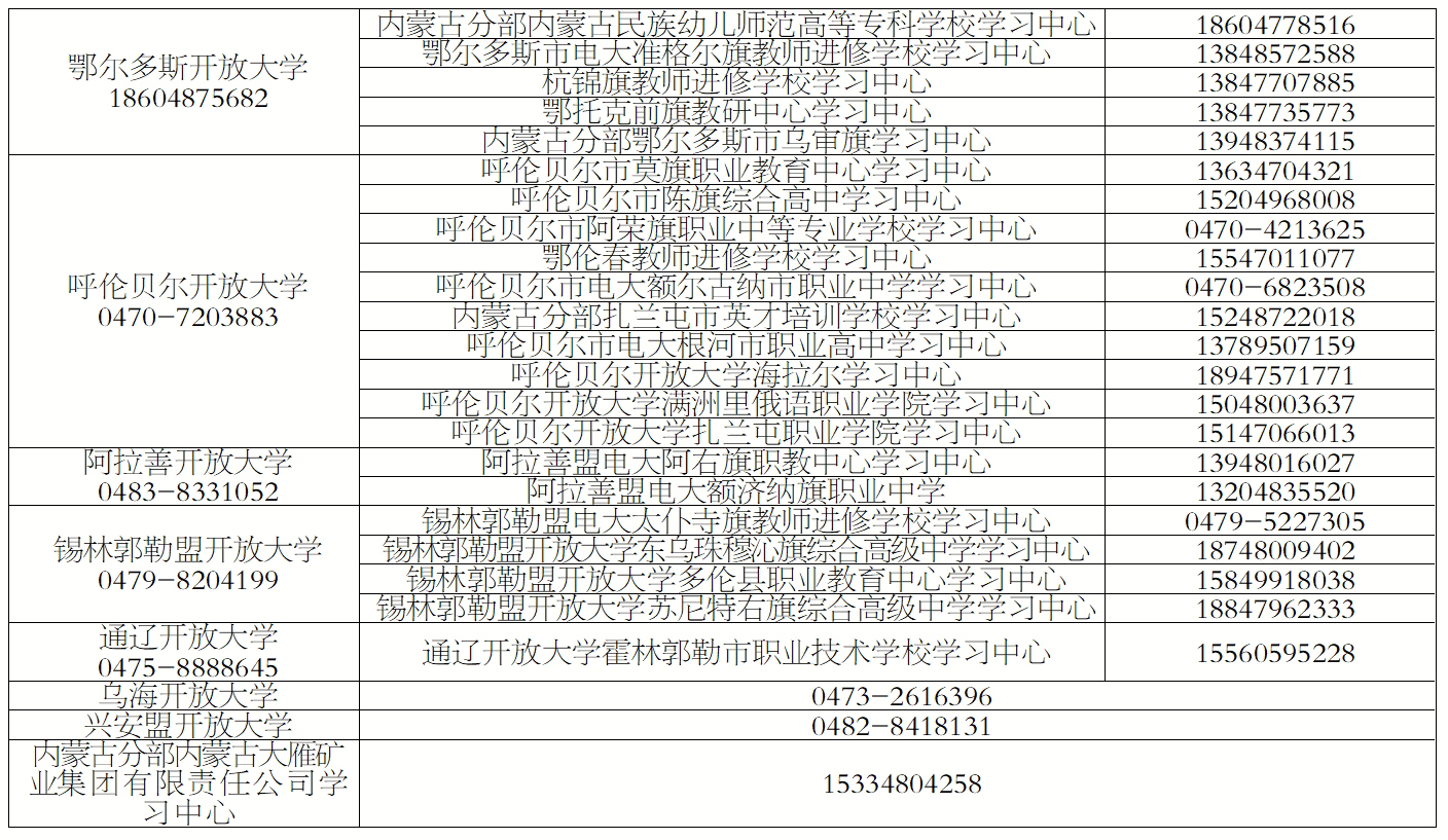 二、內(nèi)蒙古開(kāi)放大學(xué)提醒社會(huì)公眾和廣大學(xué)生,我校嚴(yán)格按照國(guó)家開(kāi)放大學(xué)批復(fù)的學(xué)習(xí)中心開(kāi)展辦學(xué)行為,從未在內(nèi)蒙古地區(qū)授權(quán)代理機(jī)構(gòu)或委托個(gè)人以“國(guó)家開(kāi)放大學(xué)”或“內(nèi)蒙古開(kāi)放大學(xué)”名義代理招生。任何自稱(chēng)與“內(nèi)蒙古開(kāi)放大學(xué)”合作招生,宣稱(chēng)“不用學(xué)習(xí)”、“不用考試”、“免試免考拿證”、“包學(xué)包過(guò)”、“報(bào)名=畢業(yè)”等虛假宣傳以及亂收費(fèi)行為,均為違法行為。我校享有“內(nèi)蒙古開(kāi)放大學(xué)”名稱(chēng)的專(zhuān)屬使用權(quán),任何單位和個(gè)人未經(jīng)我校允許均無(wú)權(quán)以我校名義開(kāi)展對(duì)外宣傳。若查實(shí)相關(guān)機(jī)構(gòu)或個(gè)人存在侵權(quán)行為,我校將保留一切訴之法律途徑解決的權(quán)利,由此造成的后果全部由侵權(quán)行為人承擔(dān)。