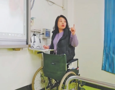 因?yàn)闊o法行走,王秀穎上課只能依靠輪椅。為了不影響教學(xué),她把輪椅滑到幻燈機(jī)前,跪在輪椅上,找到合適的高度,一邊講解,一邊演算、書寫。