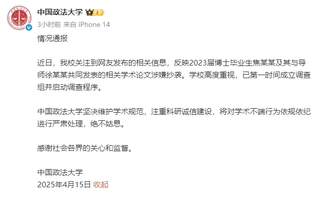 人民網(wǎng)北京4月15日電 (記者孫競)今天上午,中國政法大學(xué)發(fā)布情況通報稱,該校關(guān)注到網(wǎng)友發(fā)布的相關(guān)信息,反映2023屆博士畢業(yè)生焦某某及其與導(dǎo)師徐某某共同發(fā)表的相關(guān)學(xué)術(shù)論文涉嫌抄襲。學(xué)校高度重視,已第一時間成立調(diào)查組并啟動調(diào)查程序。