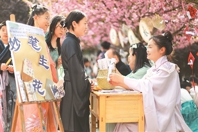 近年來(lái),為更好地傳承詩(shī)歌文化,貴州省黔西市觀音洞鎮(zhèn)沙井小學(xué)每年春天都會(huì)舉辦校園詩(shī)歌文化節(jié)系列活動(dòng),老師帶領(lǐng)學(xué)生身著漢服寫詩(shī)歌,朗誦詩(shī)歌,猜詩(shī)歌謎語(yǔ)。圖為學(xué)生在向老師朗誦自己寫的詩(shī)歌。