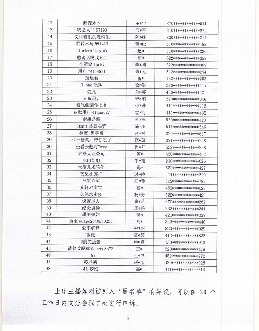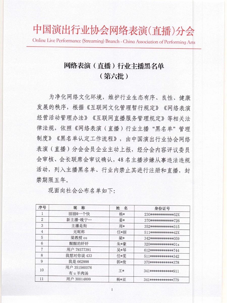 根據(jù)《互聯(lián)網(wǎng)文化管理暫行規(guī)定》《網(wǎng)絡(luò)表演經(jīng)營活動(dòng)管理辦法》《互聯(lián)網(wǎng)直播服務(wù)管理規(guī)定》等相關(guān)法律法規(guī),按照《網(wǎng)絡(luò)表演(直播)行業(yè)主播“黑名單”管理制度》《黑名單認(rèn)定工作流程》規(guī)定,中國演出行業(yè)協(xié)會(huì)網(wǎng)絡(luò)表演(直播)分會(huì)現(xiàn)向社會(huì)公布第六批主播黑名單,被列入黑名單的主播將在行業(yè)內(nèi)禁止注冊(cè)和直播,封禁期限5年。(總臺(tái)央視記者曹巖)