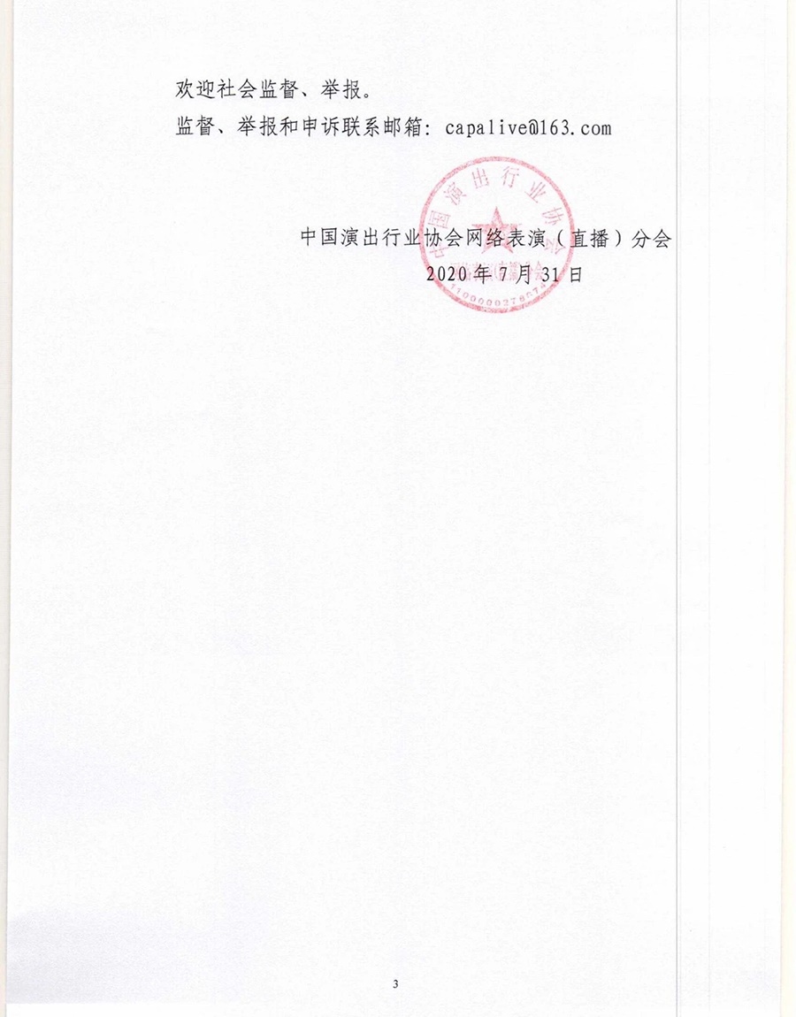 中國演出行業(yè)協(xié)會(huì)網(wǎng)絡(luò)表演(直播)分會(huì)8月9日發(fā)布: